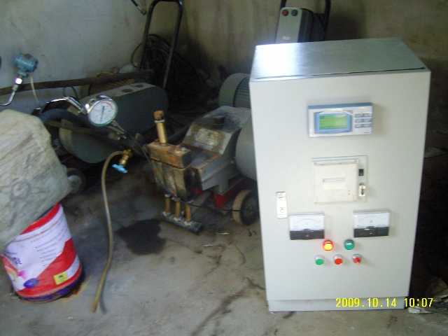 该泵在使用前,只需在电接点压力表上设定上下限压力值及在时间继电器上设置保压时间,然后在一定距离内使用遥控器启动试压泵,或按启动按钮开泵。当压力达到事先设定的上限目标值时,试压泵会自动停止进入保压状态,当保压时间到,这时自动报警器开始鸣叫,打开手动泄压阀卸除系统压力(可改手动泄压为自动泄压,选择性功能需要增加费用),实验完毕。该设备同时还具有手动梯度升压功能,当压力下降到预设压力值下限时试压泵启动,该试压泵在完成压力试验过程中,可以显示实时压力数值和实时压力曲线,自动记录升压值及升压保压过程的曲线变化并存储与打印历史报表等功能。